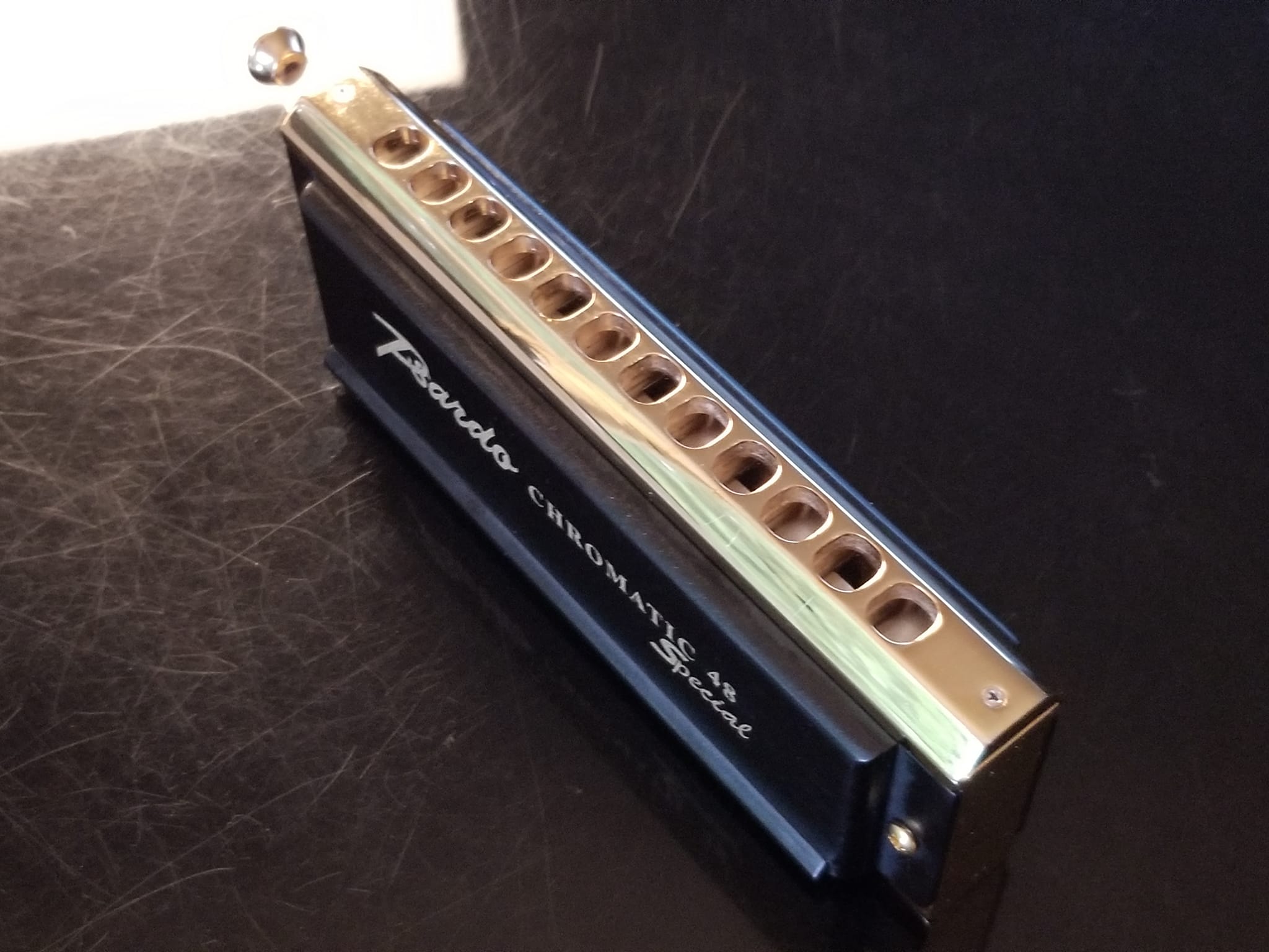 Psardo Another more recent company to produce high-end chromatic harmonicas is Philharmonicas. The company was founded by Phil Sardo in 2016. He produces a range of high- and medium-end 12 and 16 hole instruments. All come either with brass or aluminum combs. The special and unique feature of the “Psardo” harmonicas are the individual two-note reed plates set into precision pockets in the body of the comb and the tubular channel covers (similar to the molded in channels of the CBH 2012/2016 covers).