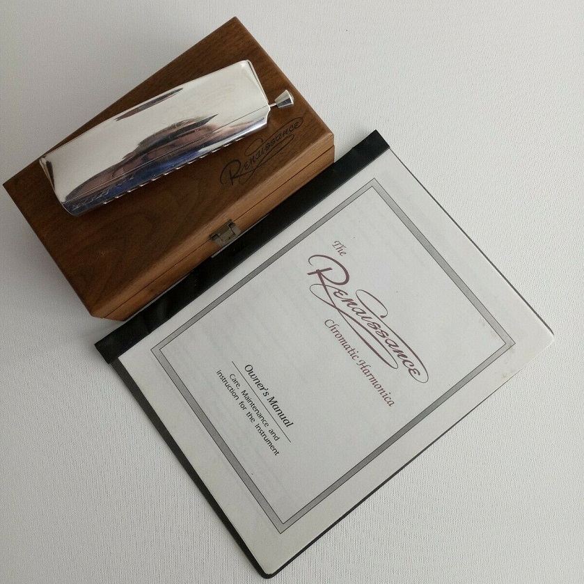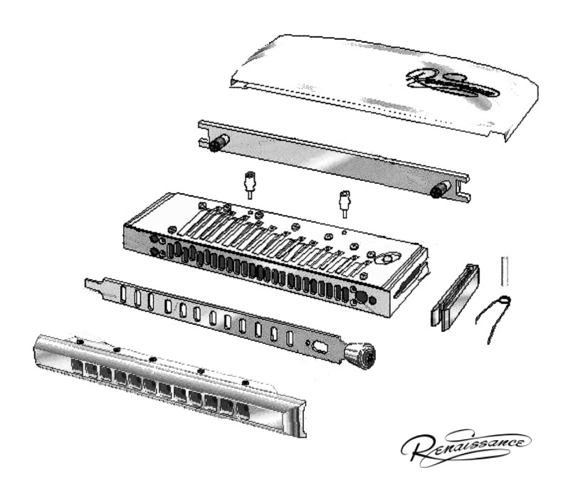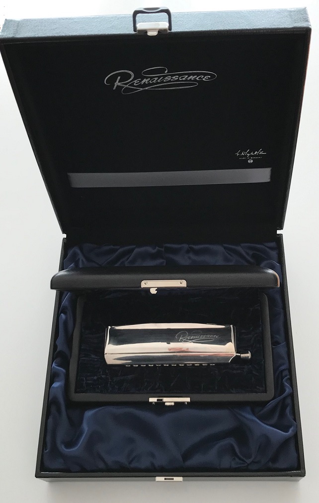 The unique and revolutionary feature of the Renaissance is the fact that it does not show any screws or screw holes on the exterior. The mouth piece is attached to the comb by long hidden screws situated at the backside of the harmonica. The covers are attached without any screws at all.