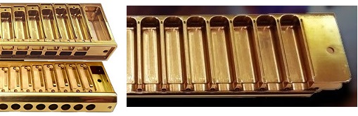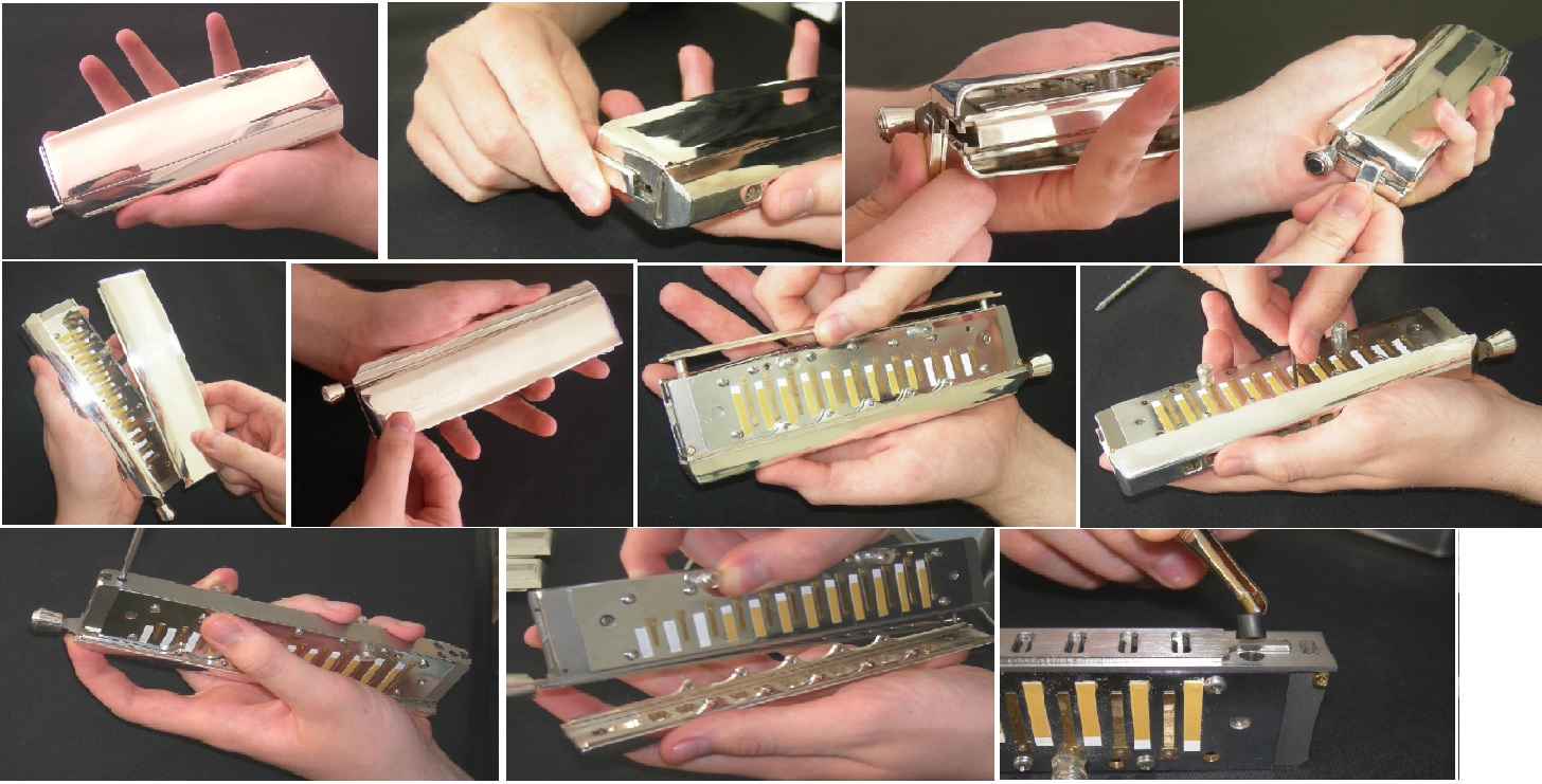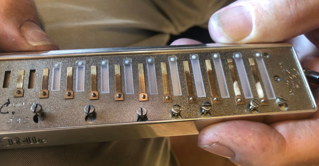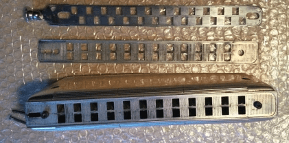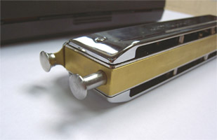 Psardo 16 hole “Gold Bar” with gold plated brass combThe “Psardo” harmonicas come with individual two-note replaceable reed plates (left) and tubular channel covers (right).Newest “Psardo” model with aluminum comb