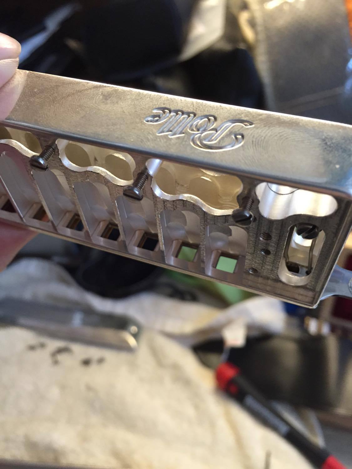 Unique Polle slide system with minimal contact pointsPolle quick change reed plate removal system. Only two screws need to be completely removed to detach the reed plate