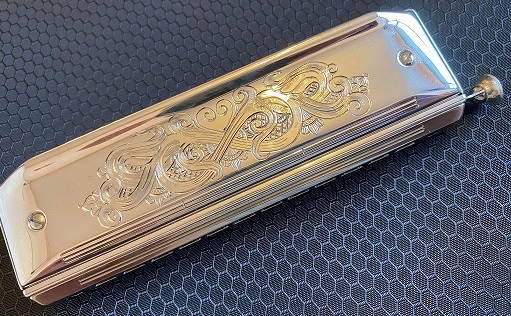 The Hohner’s “Meisterklasse” chromatic was introduced around 1982. It was the first high-end harmonica with 14 holes and an anodized aluminum comb. An additional feature were its full-length cover plates, which extend all the way to the ends of the harmonica’s comb rather than sharply angling down before the ends to form an adjoining surface parallel to the reed-plates and comb. From it’s introduction to circa 1990, Hohner received customer complaints about powdery residue originating from unplated brass reed plates contacting the aluminum comb. The production was stopped. A re-issued version came out about 3 year later (date not confirmed). Additional versions with slight improvements were released thereafter.